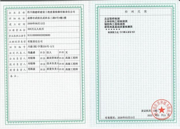 近日,經四川省住房和城鄉建設廳核準,重慶設計集團市建科院所屬子企業四川渝建研建設工程質量檢測有限責任公司(以下簡稱“渝建研”)申請重新核定的建設工程質量檢測機構資質于2023年3月成功獲批并順利取證。