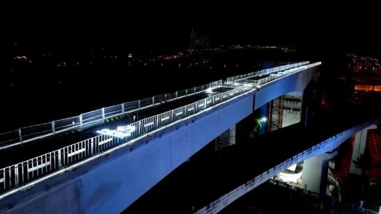 為最大程度減少對(duì)運(yùn)營(yíng)線路的影響,縮短建設(shè)工期,保障施工安全,項(xiàng)目部決定采用橋梁轉(zhuǎn)體工藝進(jìn)行施工,即在6號(hào)線兩側(cè)將T構(gòu)連續(xù)梁澆筑完成,以橋墩為軸逆時(shí)針轉(zhuǎn)體,跨越既有6號(hào)線進(jìn)行對(duì)接。7月28日1時(shí)56分,6號(hào)線東延工程劉家坪站至百樂(lè)園站高架區(qū)間的兩座T構(gòu)連續(xù)梁轉(zhuǎn)體橋開(kāi)始轉(zhuǎn)體施工,經(jīng)過(guò)52分鐘的轉(zhuǎn)體作業(yè)后,實(shí)現(xiàn)精準(zhǔn)對(duì)接,這既是6號(hào)線東延工程高架區(qū)間首座連續(xù)梁轉(zhuǎn)體,也是重慶軌道交通領(lǐng)域首次實(shí)現(xiàn)連續(xù)梁跨越既有軌道交通線路轉(zhuǎn)體,為后續(xù)類似施工提供了范本。