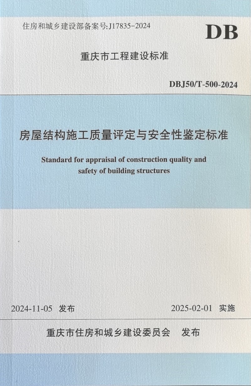 經市住房城鄉建委批準,由市建科院主編的重慶地方標準《房屋結構施工質量評定與安全性鑒定標準》(DBJ50/T-500-2024)將于2025年2月1日起施行。