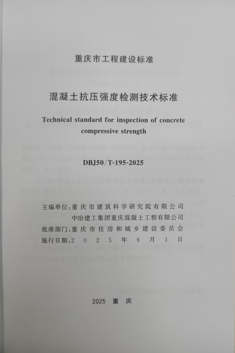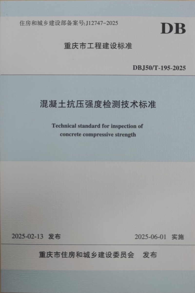 近日,由重慶設(shè)計(jì)集團(tuán)所屬子企業(yè)重慶市建筑科學(xué)研究院有限公司(以下簡(jiǎn)稱(chēng)“市建科院”)聯(lián)合中冶建工集團(tuán)重慶混凝土工程有限公司主編的重慶市《混凝土抗壓強(qiáng)度檢測(cè)技術(shù)標(biāo)準(zhǔn)》(DBJ50/T-195-2025)(以下簡(jiǎn)稱(chēng)《標(biāo)準(zhǔn)》)正式發(fā)布,經(jīng)重慶市住房和城鄉(xiāng)建設(shè)委員會(huì)批準(zhǔn),將于2025年6月1日正式實(shí)施。