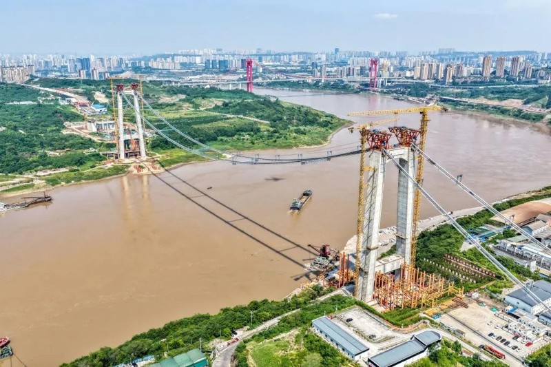 黃桷沱長江大橋全長1260米,主跨765米,采用單跨懸吊雙塔三跨連續(xù)鋼桁梁懸索橋橋型一跨過江,成為在建世界最大跨徑公軌兩用懸索橋。