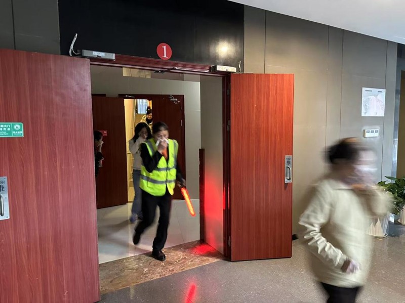 理論培訓(xùn)現(xiàn)場(chǎng),一陣急促的警報(bào)聲突然響起,火災(zāi)緊急疏散演練正式開(kāi)始。模擬火災(zāi)場(chǎng)景設(shè)定為辦公區(qū)因不明原因起火,引燃周邊可燃物,致使火勢(shì)迅速擴(kuò)大,并向樓層四周及建筑上層蔓延。現(xiàn)場(chǎng)工作人員發(fā)現(xiàn)火災(zāi)后,立即按下火災(zāi)報(bào)警裝置并按報(bào)告程序,建科大廈火災(zāi)警報(bào)、消防卷簾門等消防設(shè)施瞬間聯(lián)動(dòng)。應(yīng)急領(lǐng)導(dǎo)小組收到報(bào)告后立即啟動(dòng)消防應(yīng)急預(yù)案,各應(yīng)急小組各司其職,火速奔赴現(xiàn)場(chǎng)展開(kāi)搶險(xiǎn)。在樓層安全員的精準(zhǔn)指揮引導(dǎo)下,各樓層員工快速反應(yīng),沿著正確的疏散路線有序撤離至安全集合點(diǎn)。