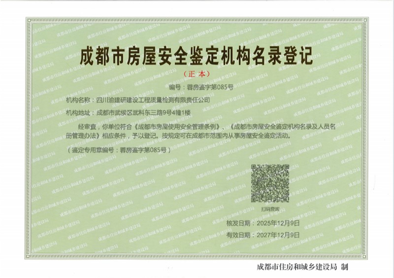 此次鑒定機構資格審查的通過,標志著四川渝建研公司在房屋安全鑒定領域的技術實力得到了成都市主管部門的肯定,公司也正式獲得參與成都市各類房屋安全鑒定項目的資質許可,可面向客戶提供專業、高效的鑒定服務。